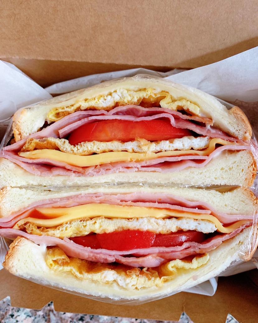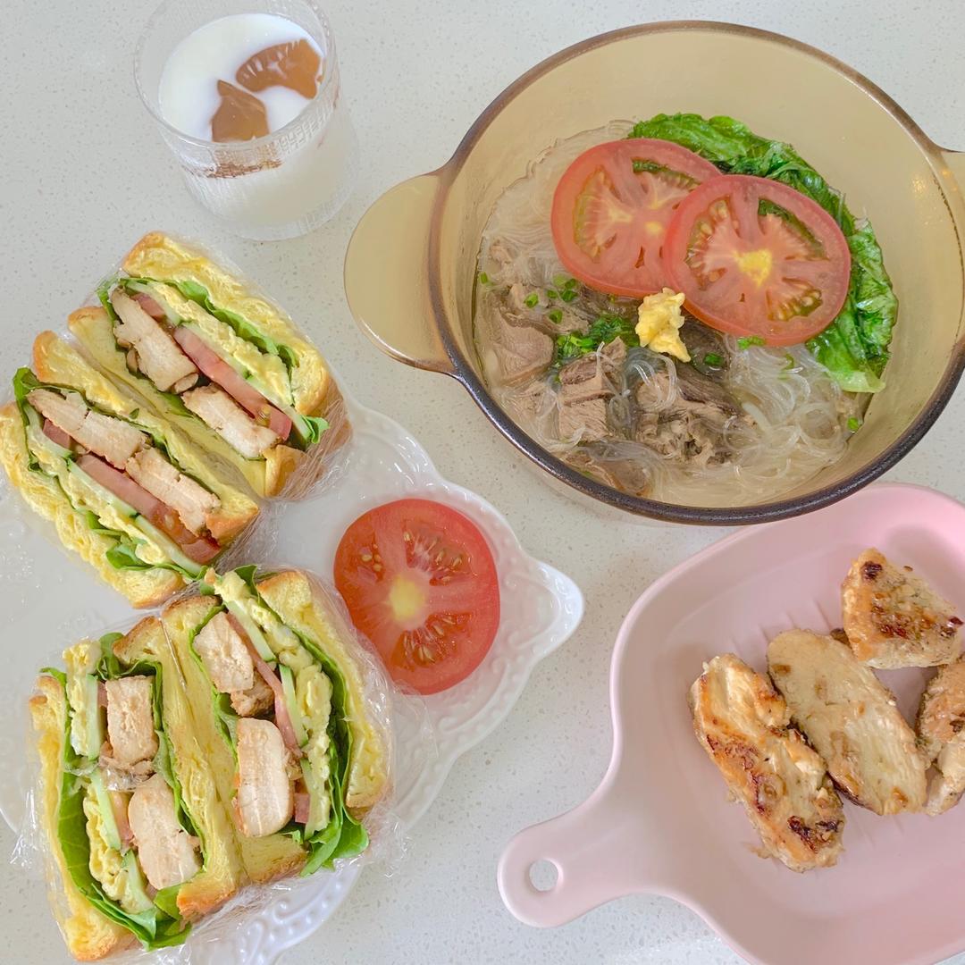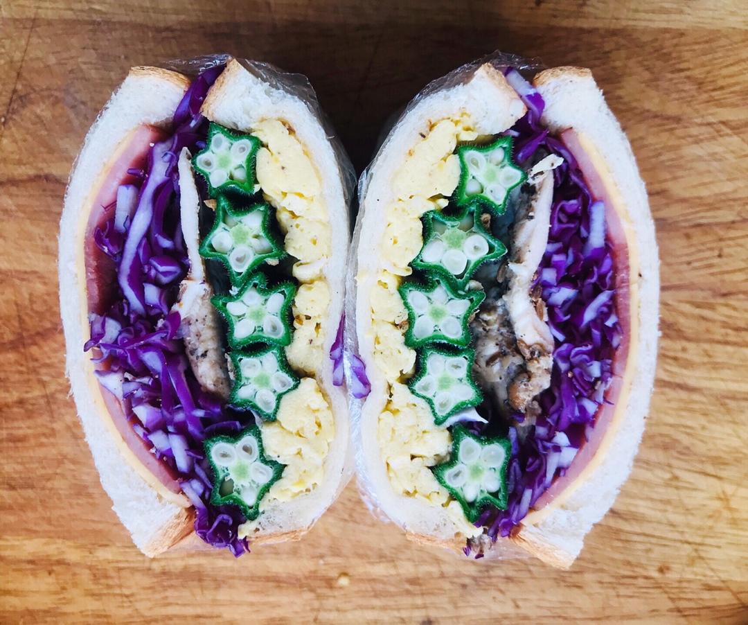 北海道吐司+鸡胸肉+黄瓜+炒蛋花+生菜+西红柿