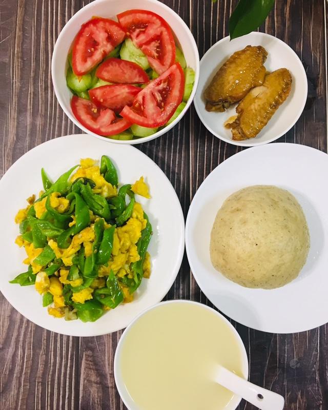 高三女生今日早餐:小米粥、红糖黑豆渣全麦馒头、青椒炒鸡蛋、卤鸡翅、糖拌黄瓜西红柿。