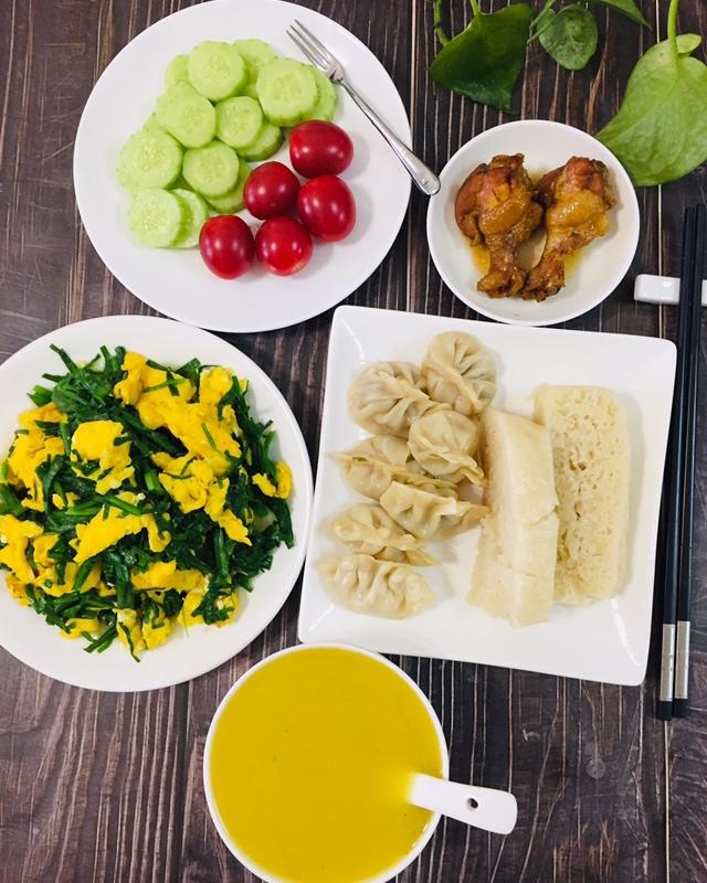 高三女生今日早餐:香薯汁、肉饺、发糕、韭菜炒鸡蛋、不老神小鸡腿、黄瓜千禧果。