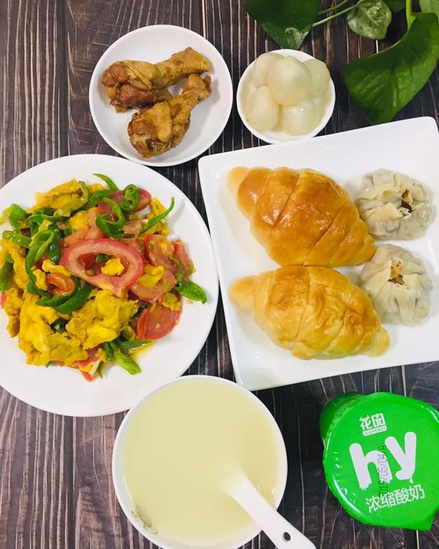 高三女生今日早餐:小米粥、小餐包、小烧麦、青椒西红柿炒鸡蛋、不老神小鸡腿、鲜荔枝。
