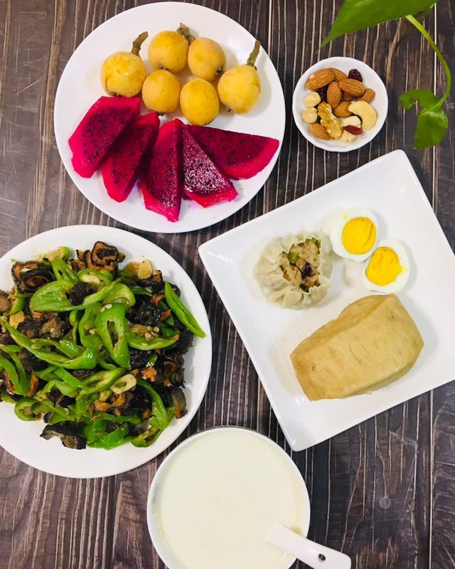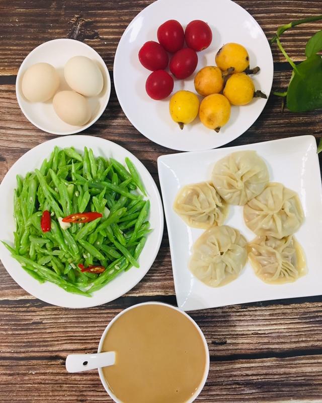 高三女生今日早餐:红枣核桃燕麦汁、现包的烧麦皮版汤包、鸡蛋、炒四季豆、水果。