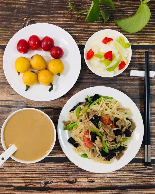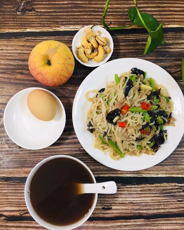 高三女生今日早餐:红豆汁、肉沫黑木耳豆角炒面、鸡蛋。