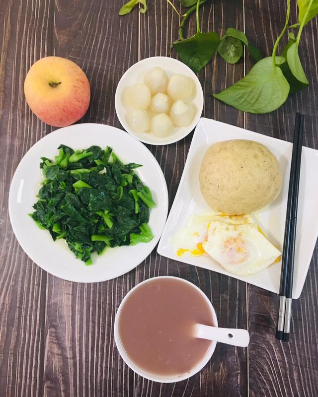 高三女生今日早餐:小米紫米粥、红糖黑豆全麦馒头、荷包蛋、炒青菜、鲜荔枝,苹果带学校吃。