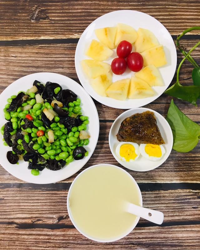 高三女生今日早餐:小米汤、肉粽子、鸡蛋、肥肉炒青豆黑木耳、水果。