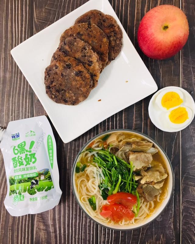 高三女生今日早餐:羊肉雪藕面、红豆饼、鸡蛋、酸奶,苹果带学校吃。