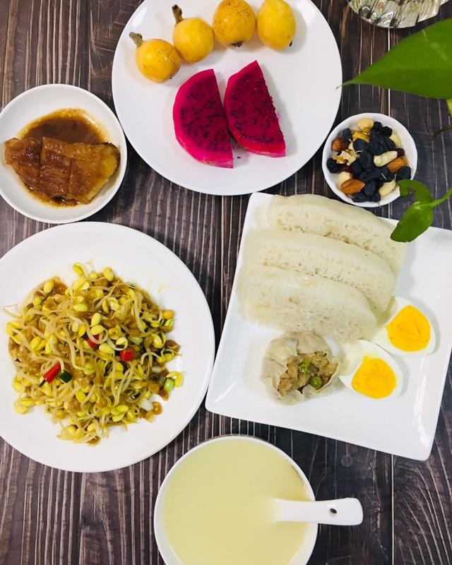 高三女生今日早餐:小米粥、烧麦、龙游发糕、鸡蛋、炒黄豆芽、煎雪鱼、水果、坚果