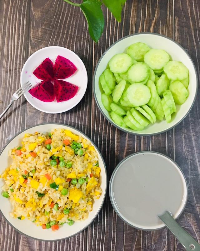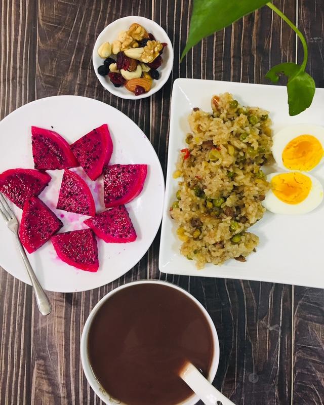 高三女生今日早餐:红豆汁、豌豆土豆肉丝炒糯米饭、鸡蛋、红心火龙果、坚果。