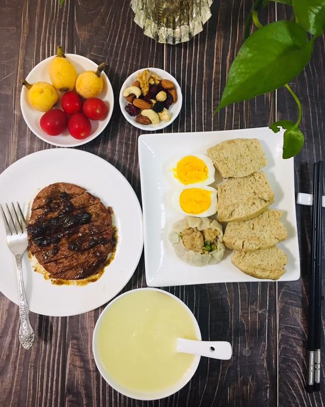 高三女生今日早餐:小米粥、烧麦、红糖黑豆渣馒头、鸡蛋、煎黑椒雪花牛排、水果、坚果。