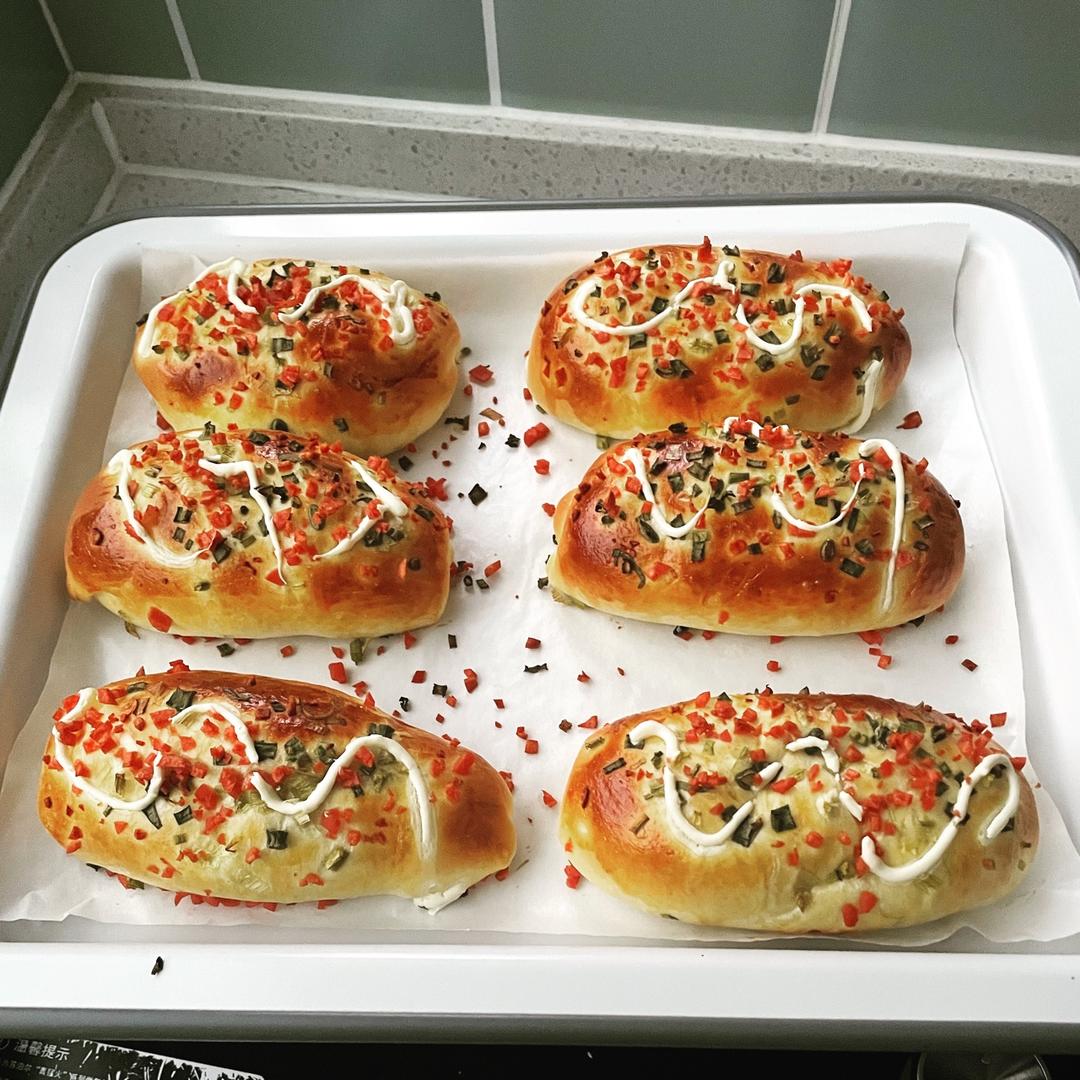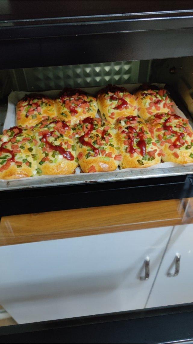 第一次做咸面包 肉松和沙拉酱塞的有点多,成品有点咸了,一口下去全是馅儿没有面包了😂...