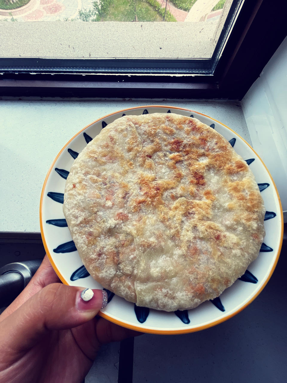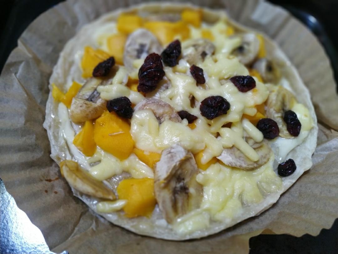 临时决定,两个手抓饼叠放一起做披萨饼底,香蕉黑了,芒果多了点,水分就大,可以多烤一会儿,出炉后没有拉丝,芝士碎再多点就好...
