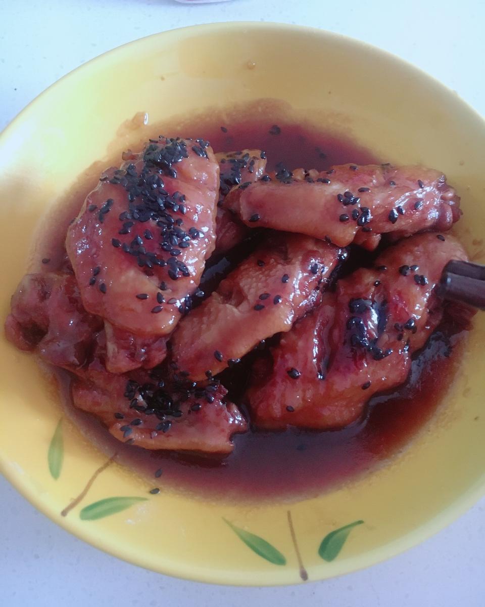我拍太用力了,肉都烂了,我的锅也不能煎到金黄就觉得要糊了,所以就差不多就变现在这样没有很上色了,不过味道...