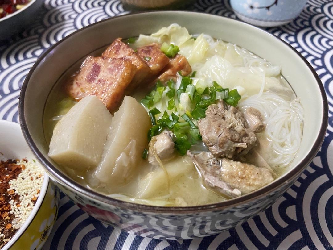 细粉干配了酸萝卜老鸭汤,加了几片午餐肉
