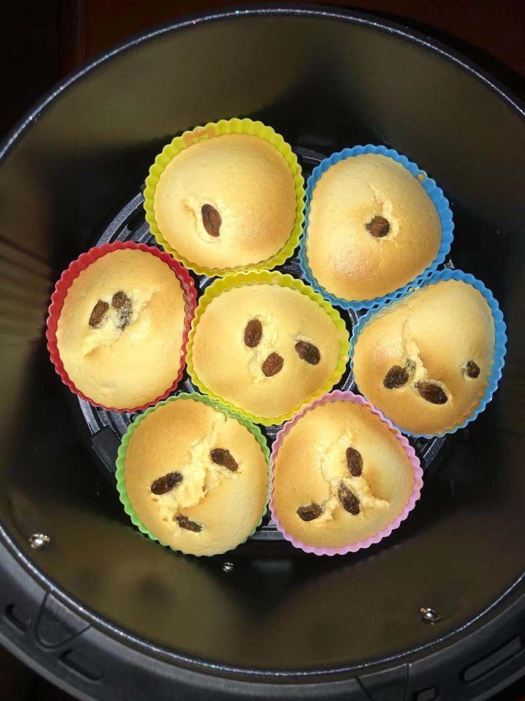 今天第一次用空气炸锅做小蛋糕,挺成功,孩子一口气吃了六个,我试了一下味道挺好的,很细腻绵软,小蛋糕上面撒的是葡萄干#空气...