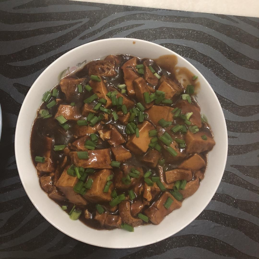 偷懒省事,用红烧鸡翅的汁直接焖了一下炸过的豆腐😊嗯,还挺好吃的。