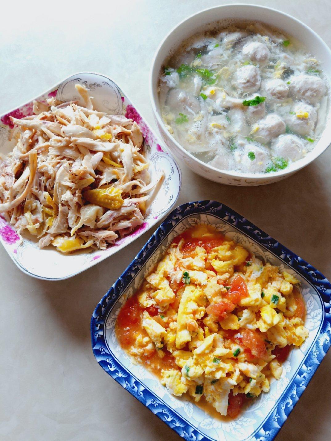 手撕鸡,番茄炒鸡蛋,肉丸菇子汤。