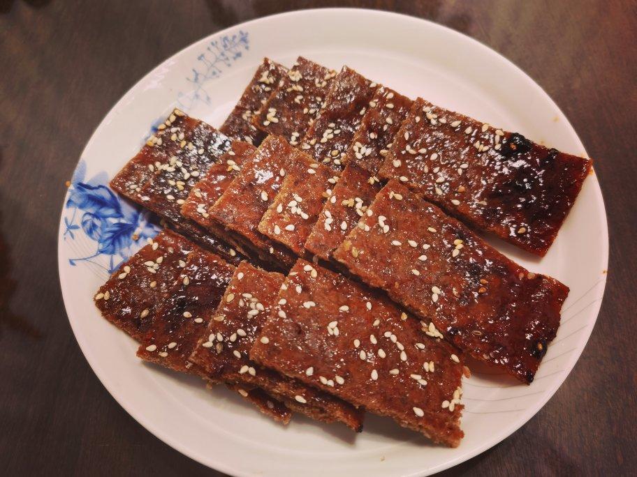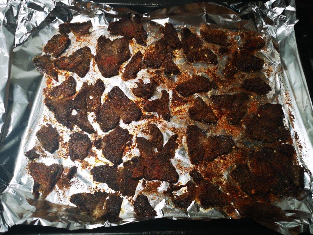 将腌制好的牛肉块切成小片,撒上孜然、五香和辣椒,放入烤箱烤20分钟~香味浓郁的家庭版自制牛肉干就齐活啦