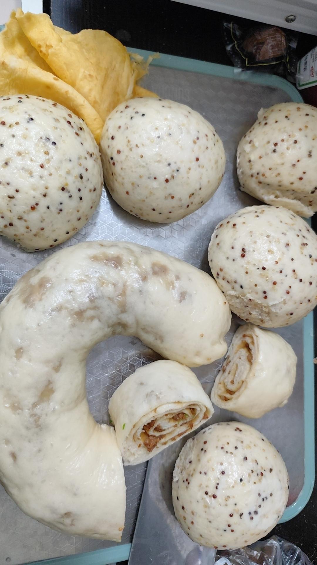 2025年11月4日晴。今天做了藜麦馒头和肉龙。和面的时候放了白糖,发的很好。