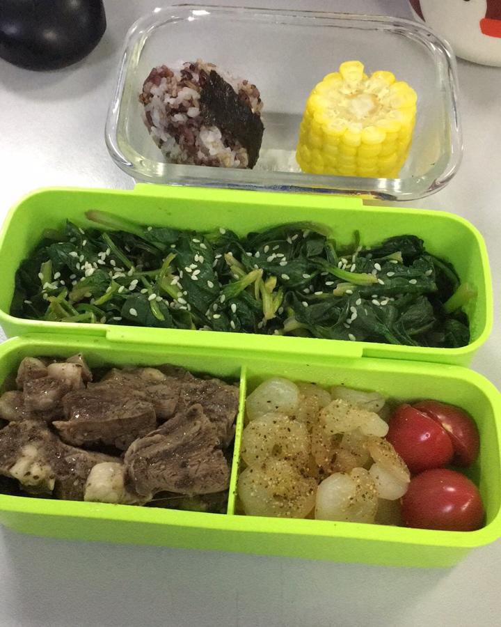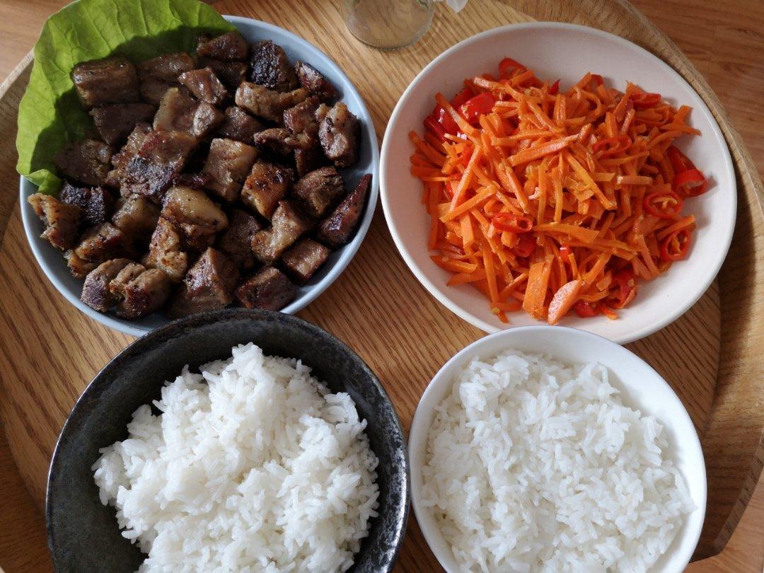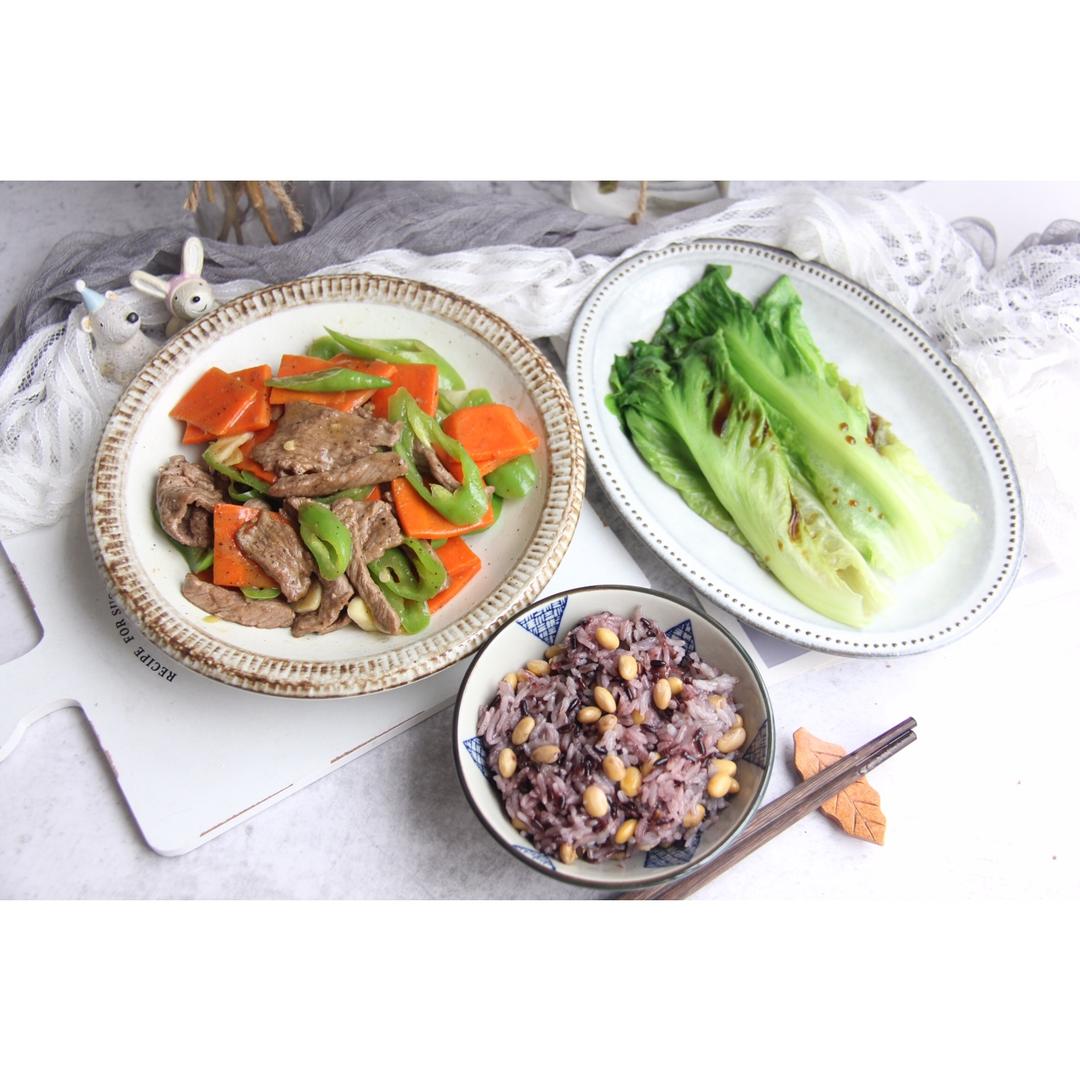 今日午食:胡萝卜黑椒炒牛肉🐂➕蚝油生菜🥬➕黄豆黑米饭🍚