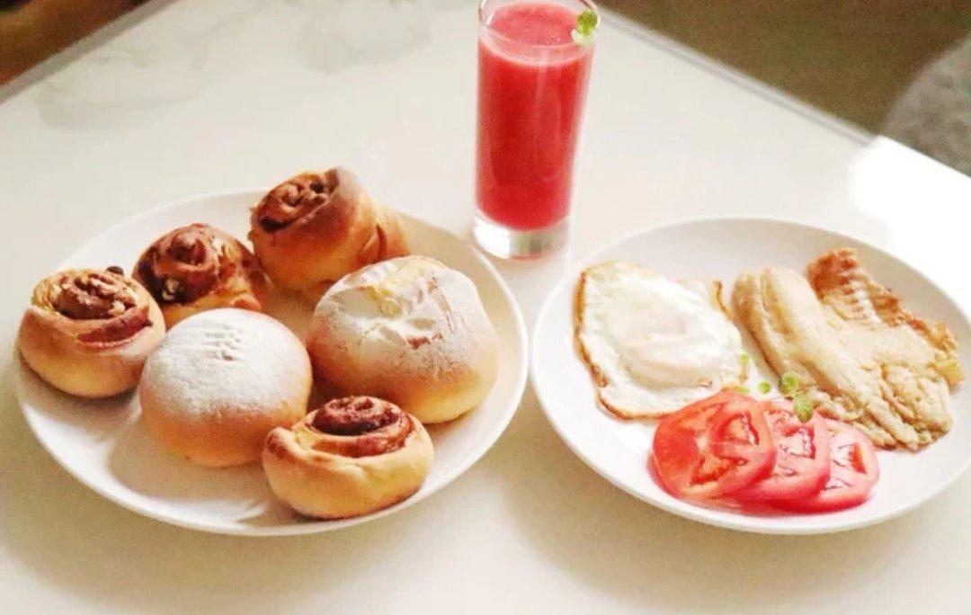 某天早餐~ 配了晚上做的红糖肉桂卷和奶酪包 树莓汁 一个阳光早餐就做好啦!