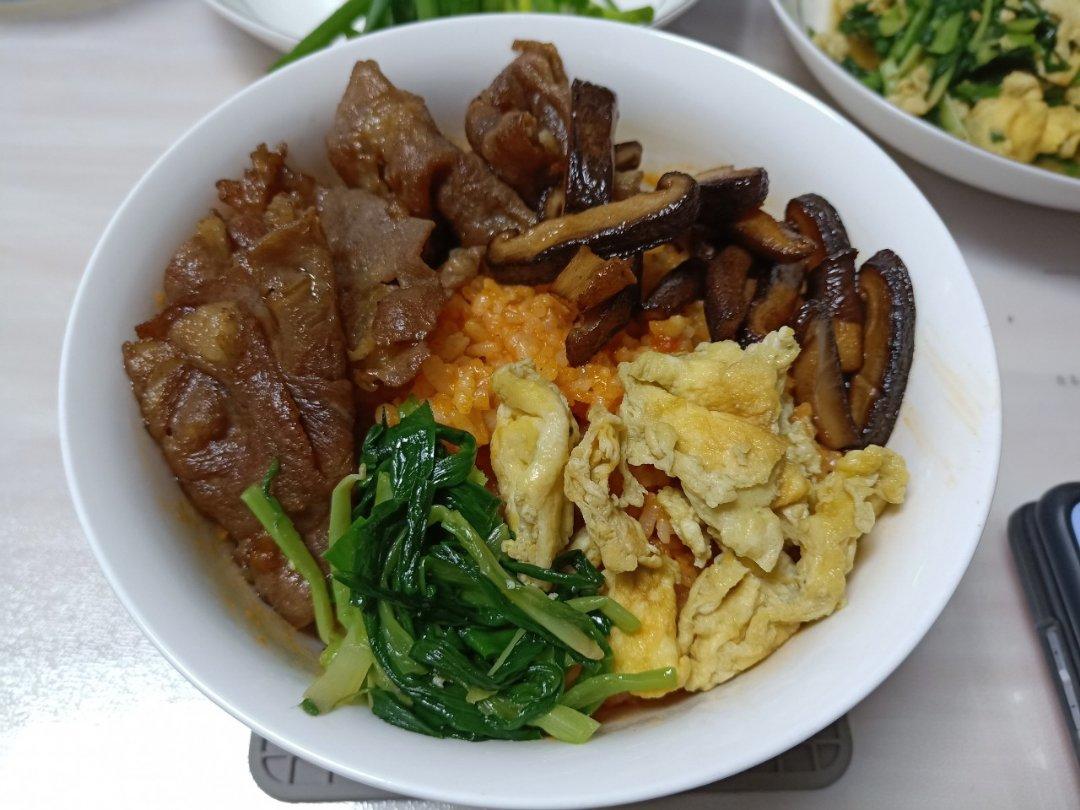 2020.03.12,肥牛韭菜香菇鸡蛋韩式辣酱拌饭。