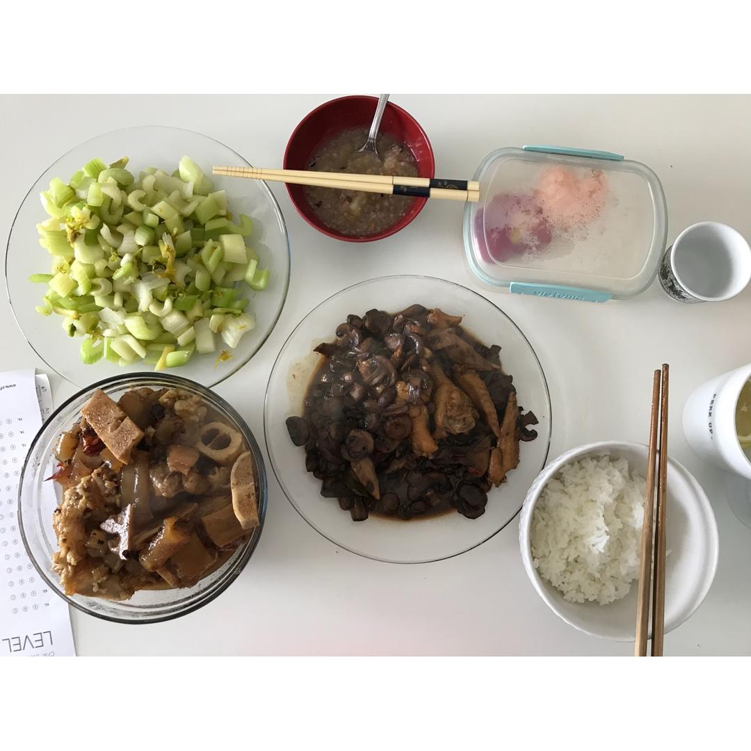 杂粮粥 炒芹菜 鸡翅蘑菇 五香牛蹄
