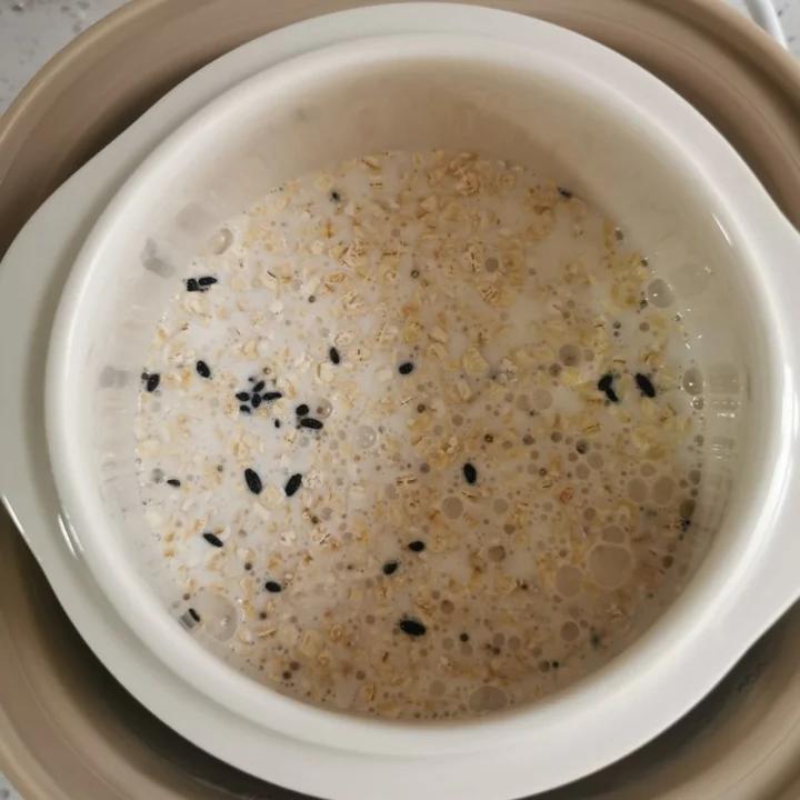 30g即食燕麦 +10g黑米(还有黑豆)+250ml牛奶+70ml...