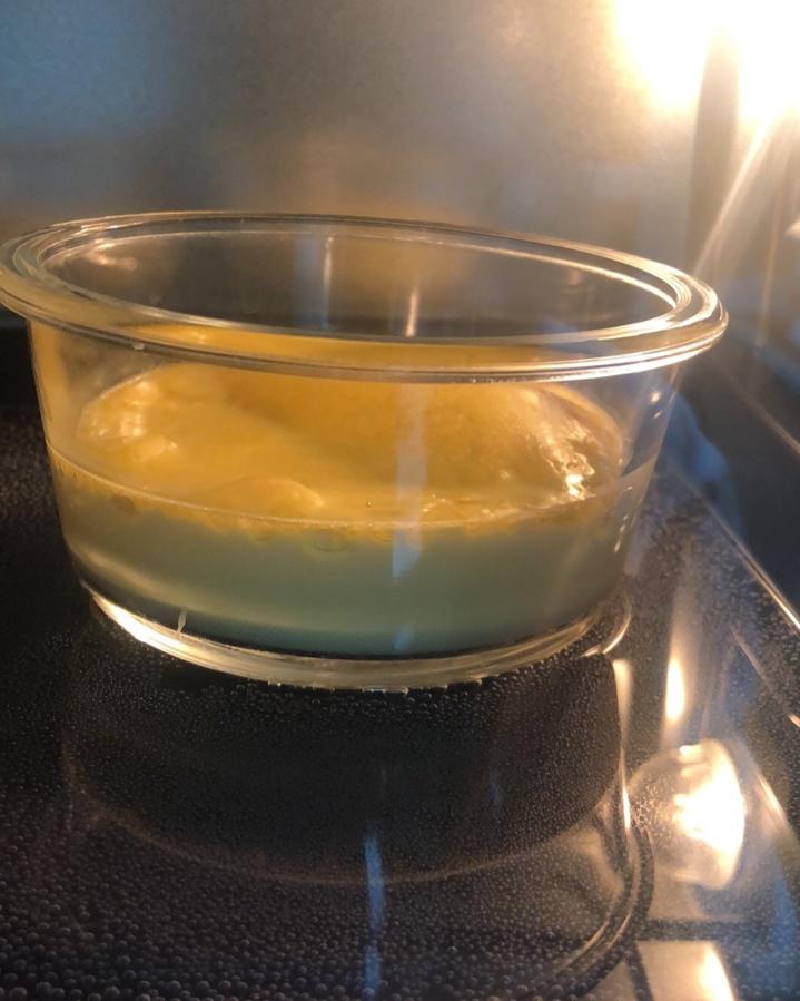 看着表面有斑纹,以为烤好了,结果第二天拿到公司,挖开表面那层,里面还是液体状态,我说怎么有分层呢😂,可能是温度,时间的问...