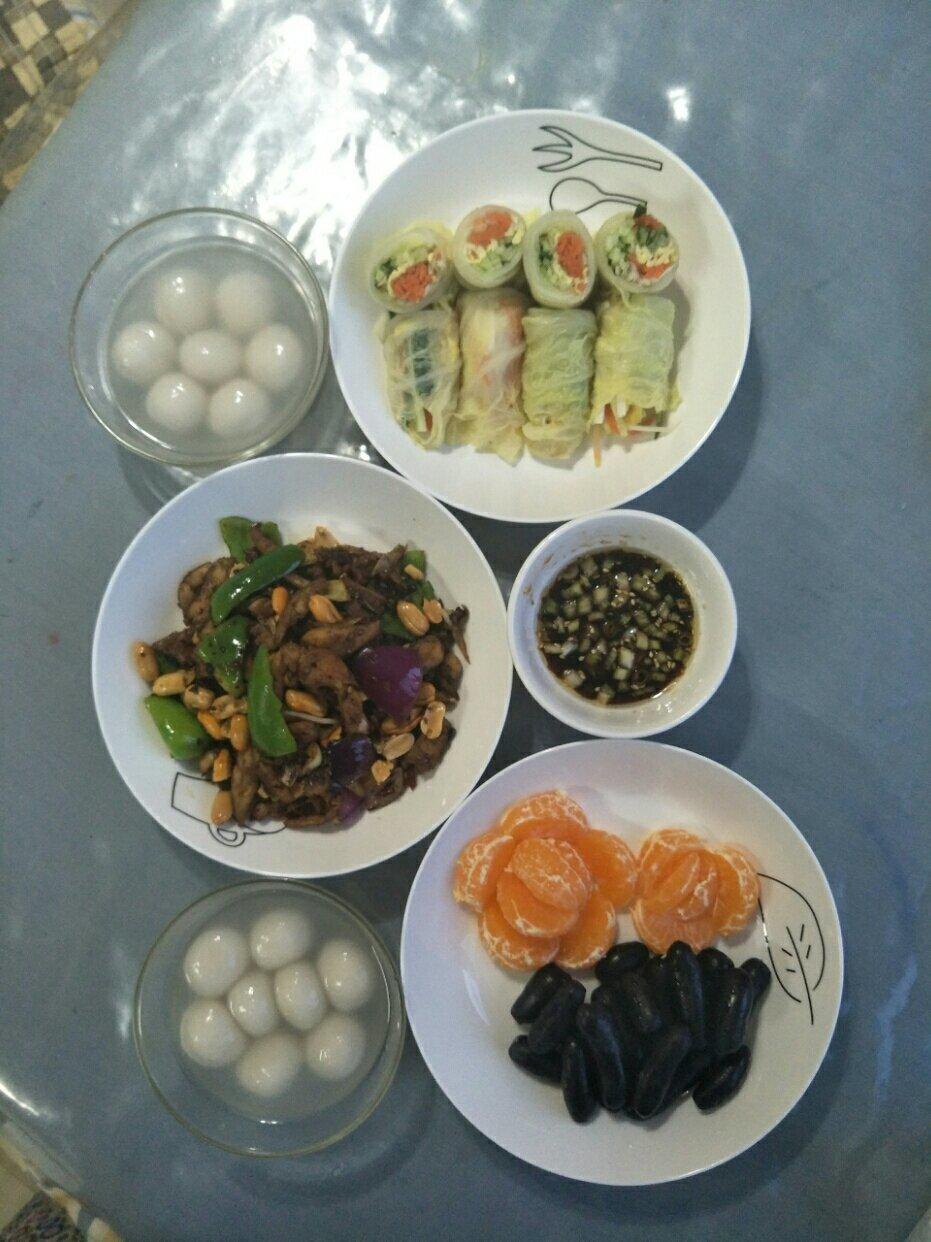 素白菜卷,小炒鸡腿肉,汤圆。