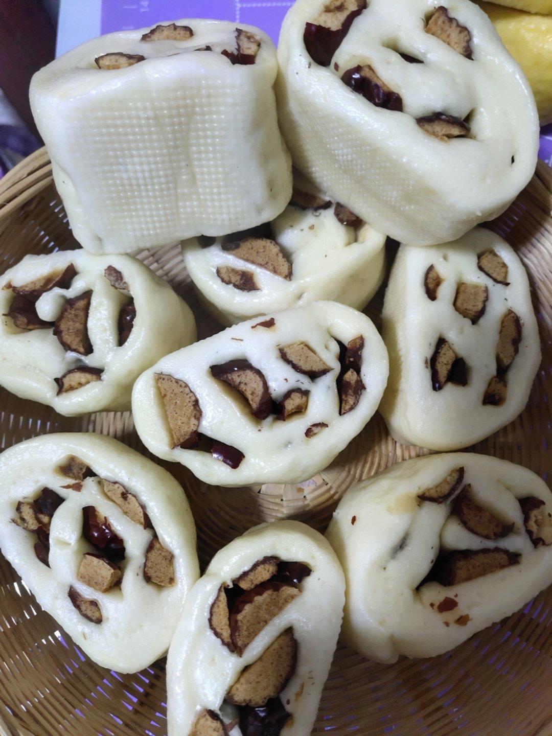 枣馍,玉米馒头红豆馅,估计是是面不够硬,醒发时都趴下了