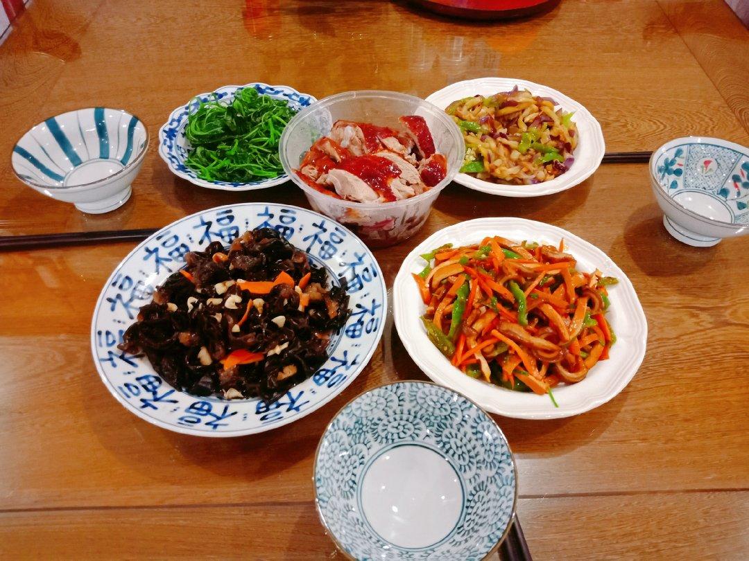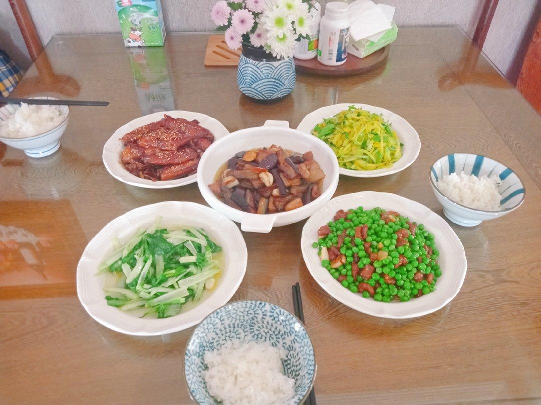 今日的午餐:小白菜、肉丁豌豆、南瓜丝、红烧茄子、可乐鸡翅