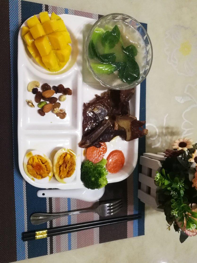今日早餐:牛仔骨+水晶饺子+煮鸡蛋+坚果+水果