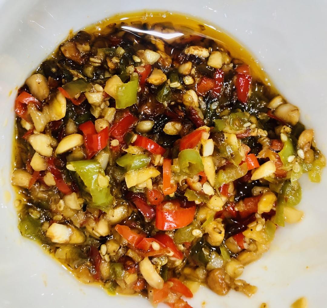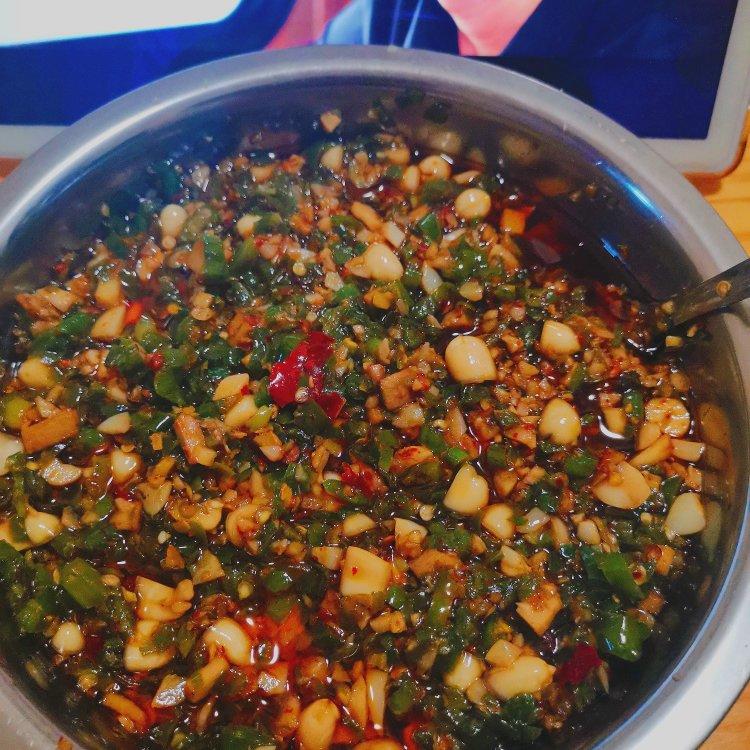线椒,红辣椒,尖椒,小米椒剁碎,蒜蓉爆香,加入各种辣椒以及花生碎。加入盐,鸡精,耗油,生抽。辣椒断生就行了...