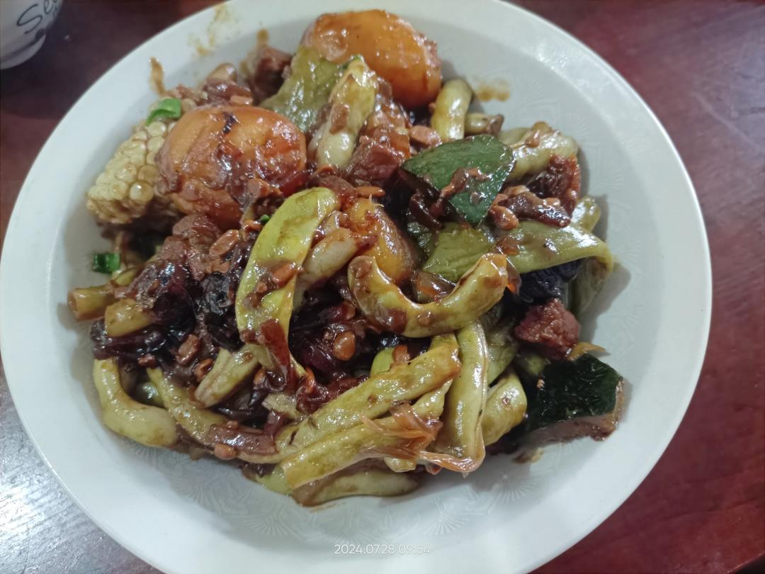 铁锅炖~芸豆、贝贝🎃、黄瓤🥔、长🍆、紫/黄🌽、尖🫑、瘦🥩、玉米面🫓~还有隐藏的粉条♥