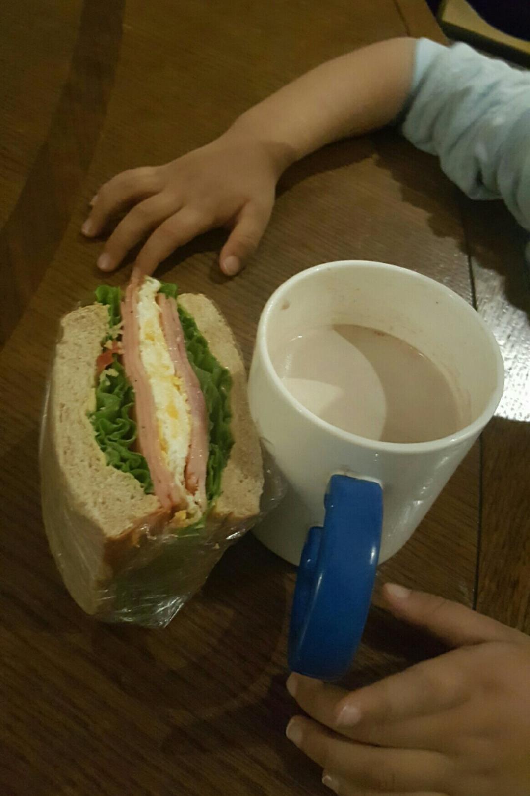 弟弟早饭:火腿煎蛋全麦三明治,巧克力奶
