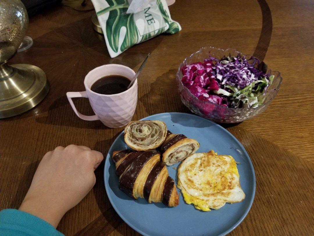 复烤的双色可颂,煎蛋,无糖酸奶蔬果沙拉,黑咖啡