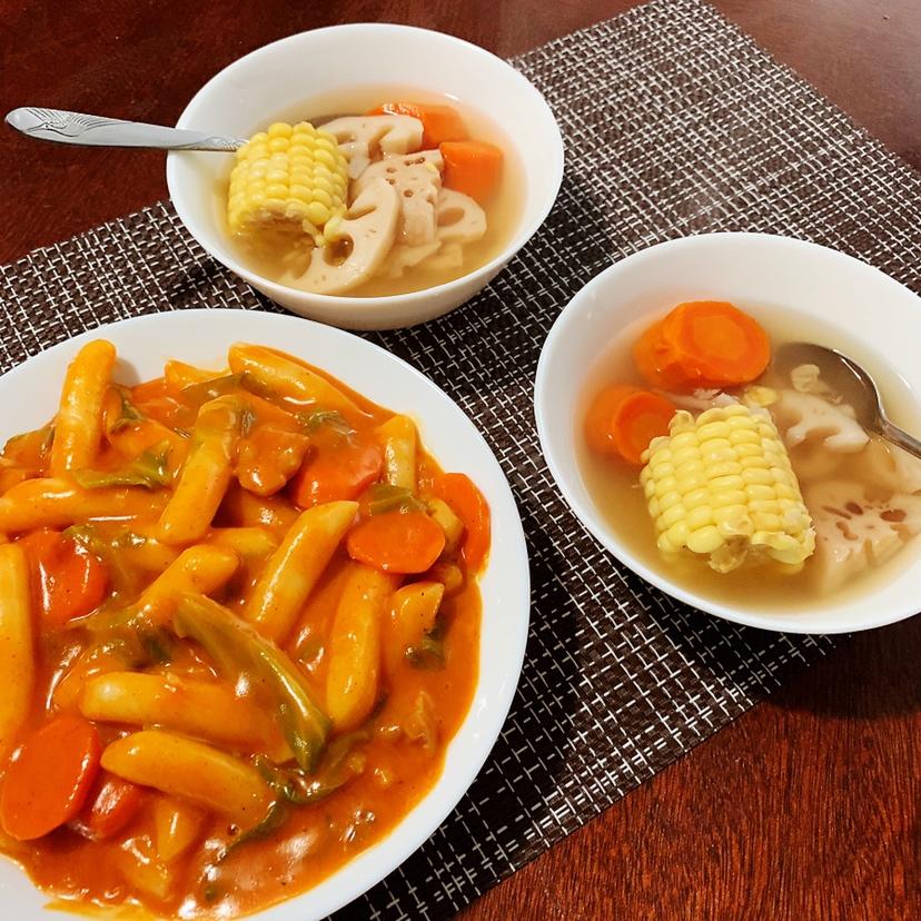 加了cheese和chicken的炒年糕+没有肉的莲藕玉米汤