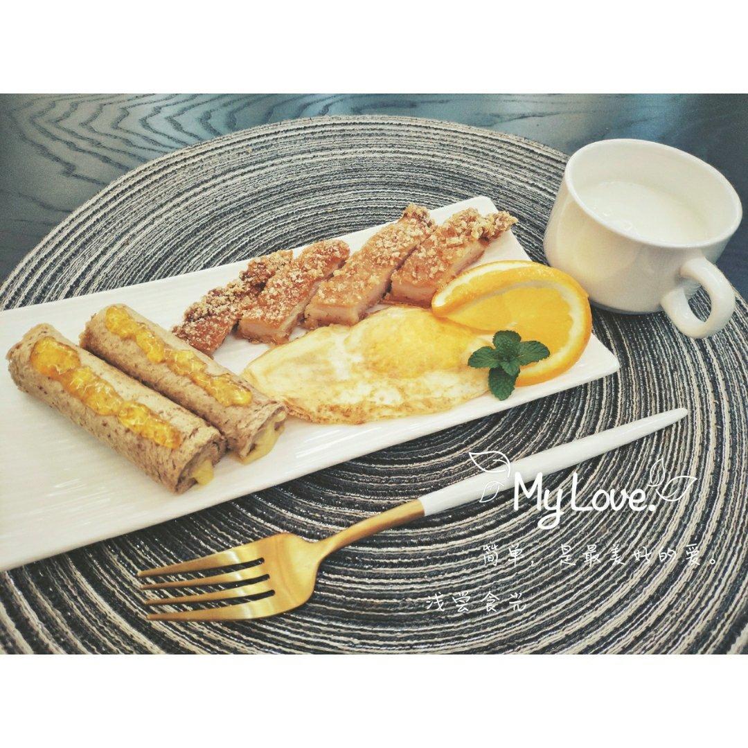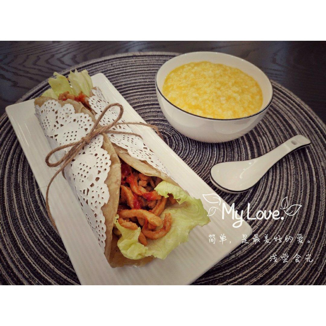 里脊肉酱料腌制一下,料足的手抓饼,配一碗电饭煲预约的二米粥,满足!