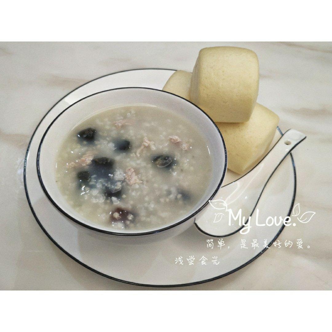 皮蛋瘦肉粥,加了小米,二米粥,姜片去大米的寒…~