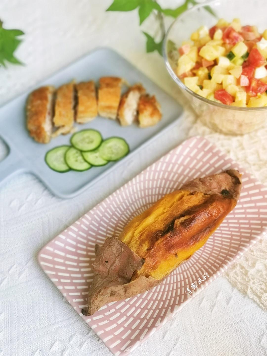 土豆沙拉、煎鸡排、烤蜜薯