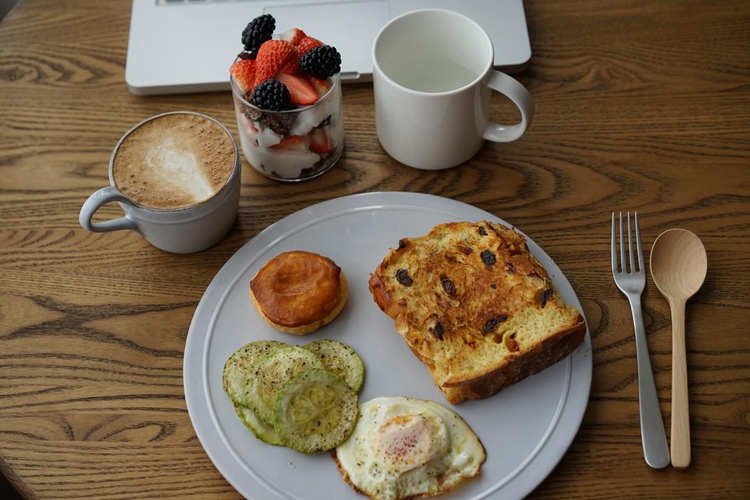 潘尼朵妮 煎西葫芦和蛋 拿铁 酸奶莓果格兰诺拉 拿铁 还有一个老婆饼