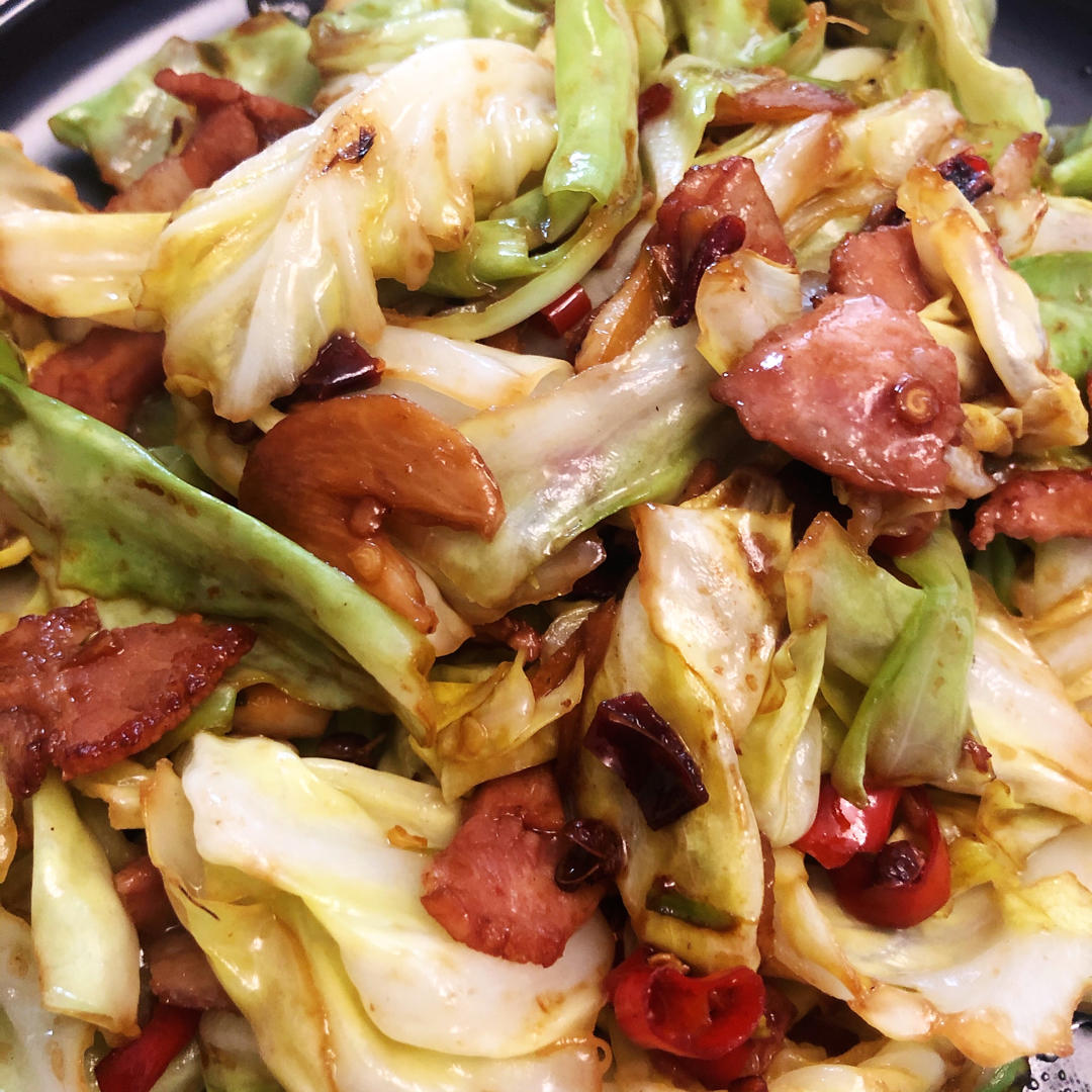 没买五花肉煎了培根代替。还拿出了我的铁锅来炒。🤨