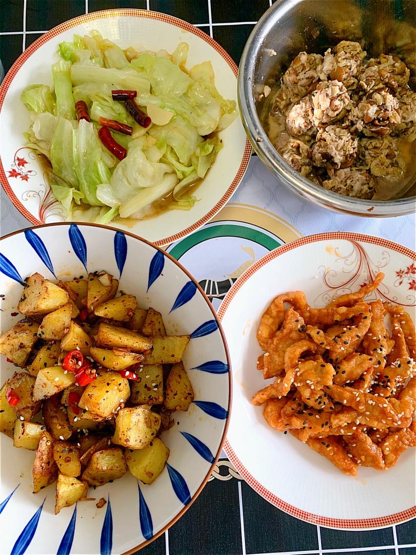 糖醋里脊,香菌酿肉,焦香土豆,手撕包菜。