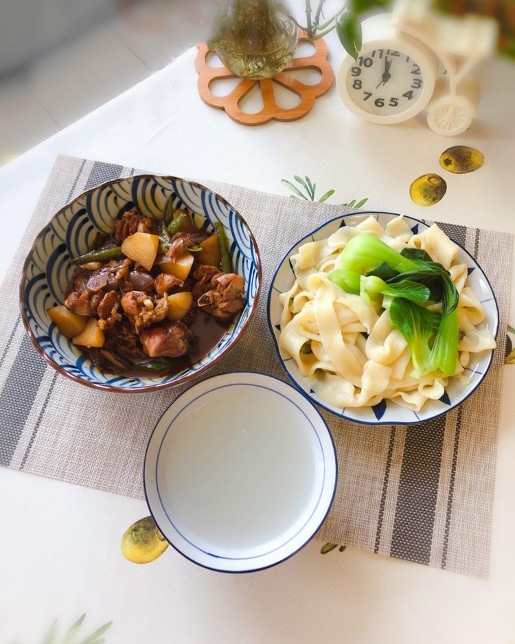 儿子的午餐:土豆鸡块拌扯面。