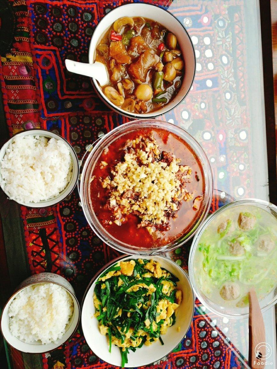 第一次做水煮牛肉!韭菜炒蛋,红烧牛筋,牛肉丸子菜汤。这样子吃,这个冬天准备长几斤呢😂