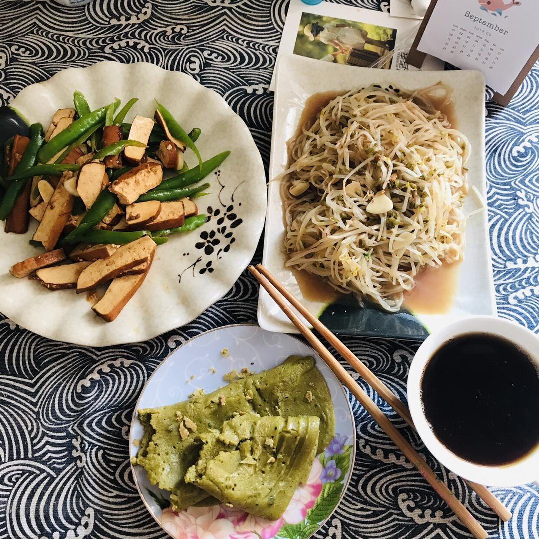卷饼。炒了土豆丝和豆芽做馅。要夸一夸这个薄饼机,真的太好用啦,加了鸡蛋的面糊做...