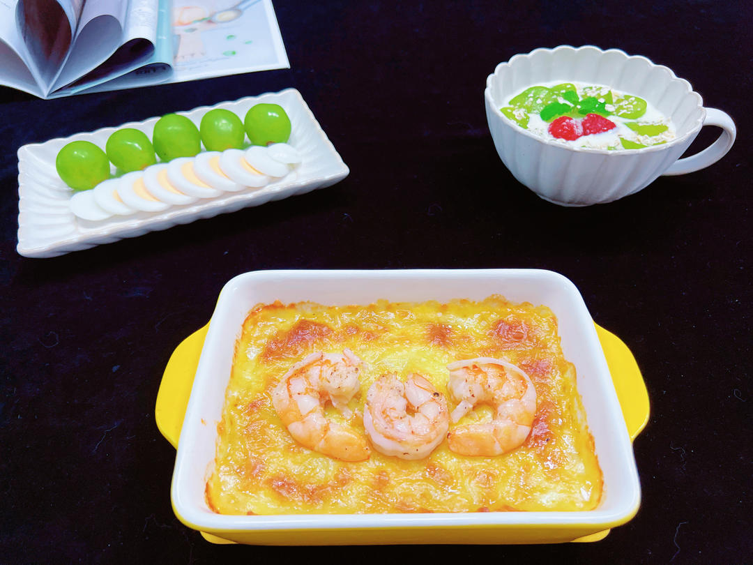 芝士焗南瓜🎃🧀+水果酸奶捞🍓🍇+鸭蛋晴王拼🍇+凉拌黄瓜🥒;图6医院的配餐 对比家里的菜 医院配餐应...