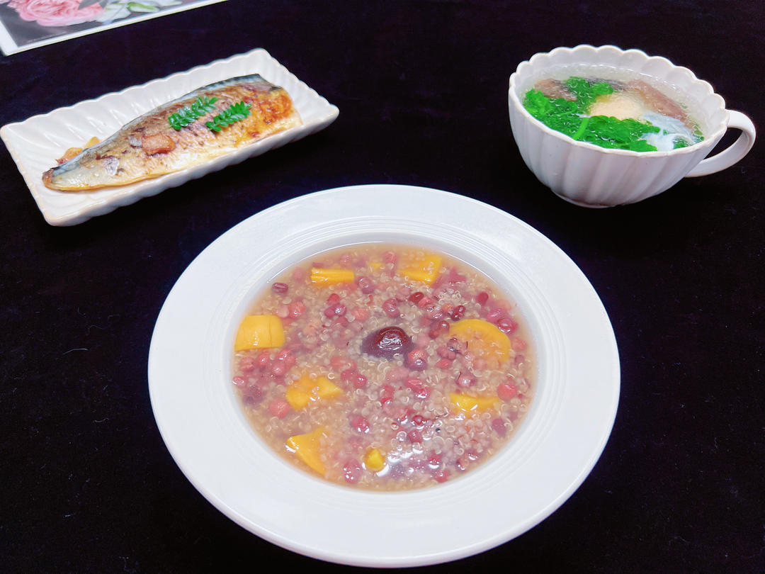 红豆藜麦地瓜粥🫘🥣+煎青花鱼🐠+牛油果🥑+海参水波蛋汤🍲;图6 来一场说走就走的旅程吧😂😂#早餐•...