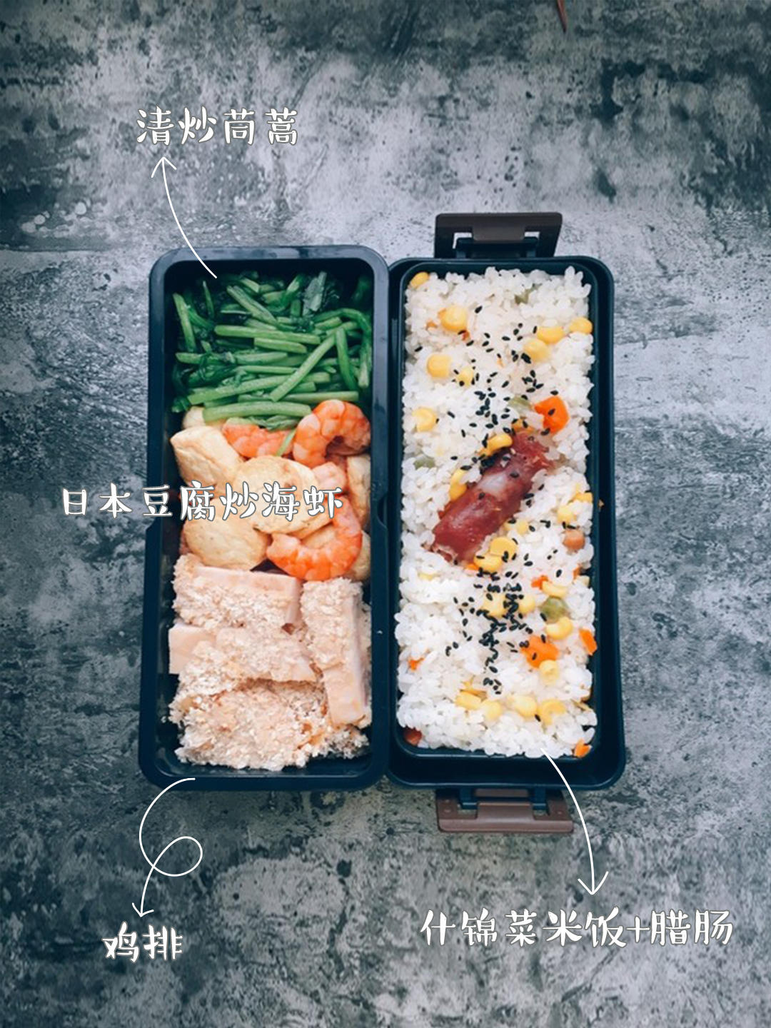 增肌便当——什锦菜煮白米饭 广式腊肠半根 烤燕麦鸡排 虾肉炒豆腐 青菜 番茄鸡蛋汤