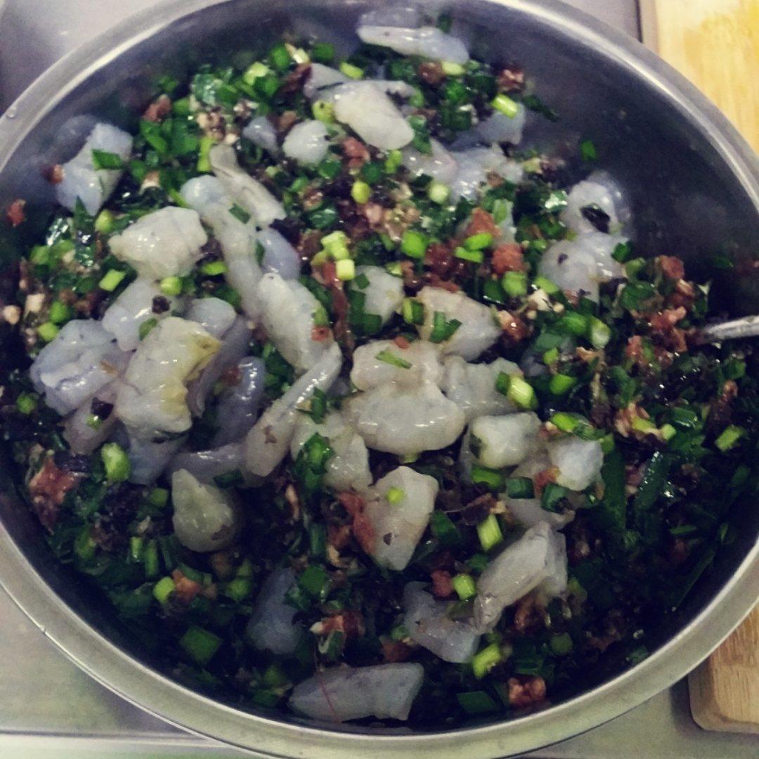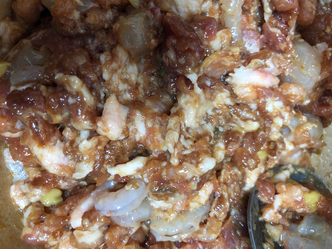 调好馅,冰箱保鲜。使调料入味。一个是虾仁肉。一个是蛤蜊肉虾仁肉韭菜。
