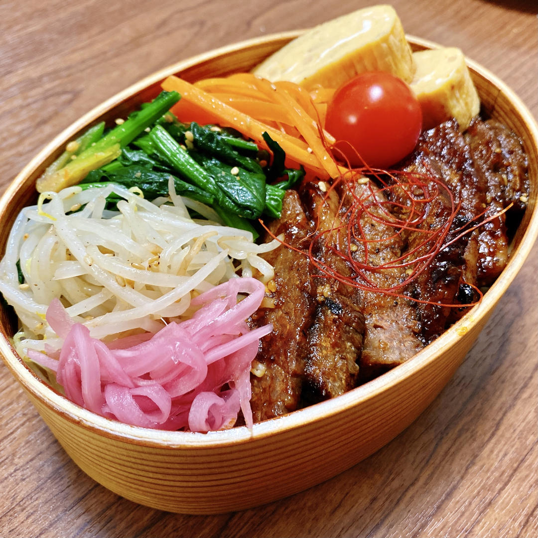 今天是北海道产“去骨牛小排”的烤肉便当。搭配姜丝厚蛋烧、凉拌三色蔬...